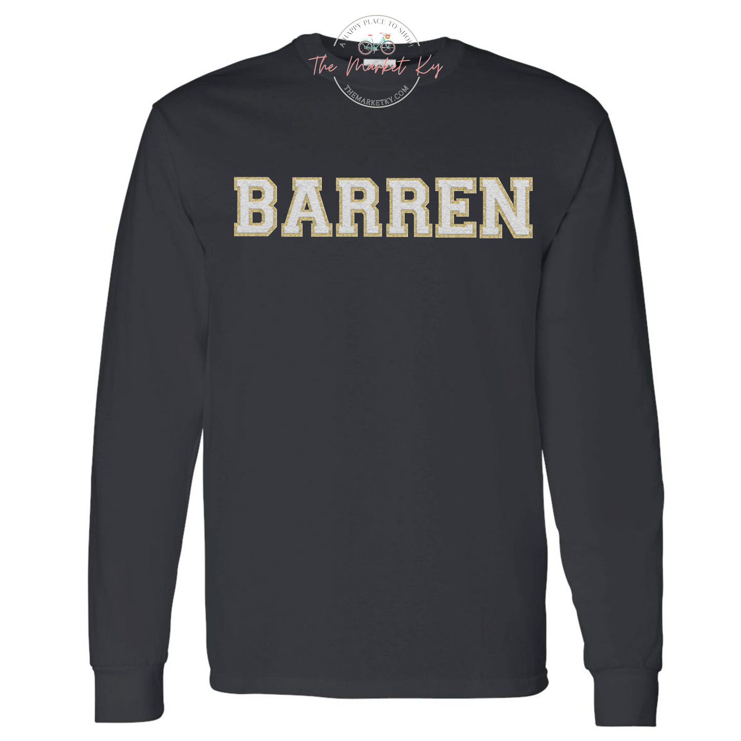 Unisex long sleeve tee with original design in faux chenille letters. These are printed as ordered in house.