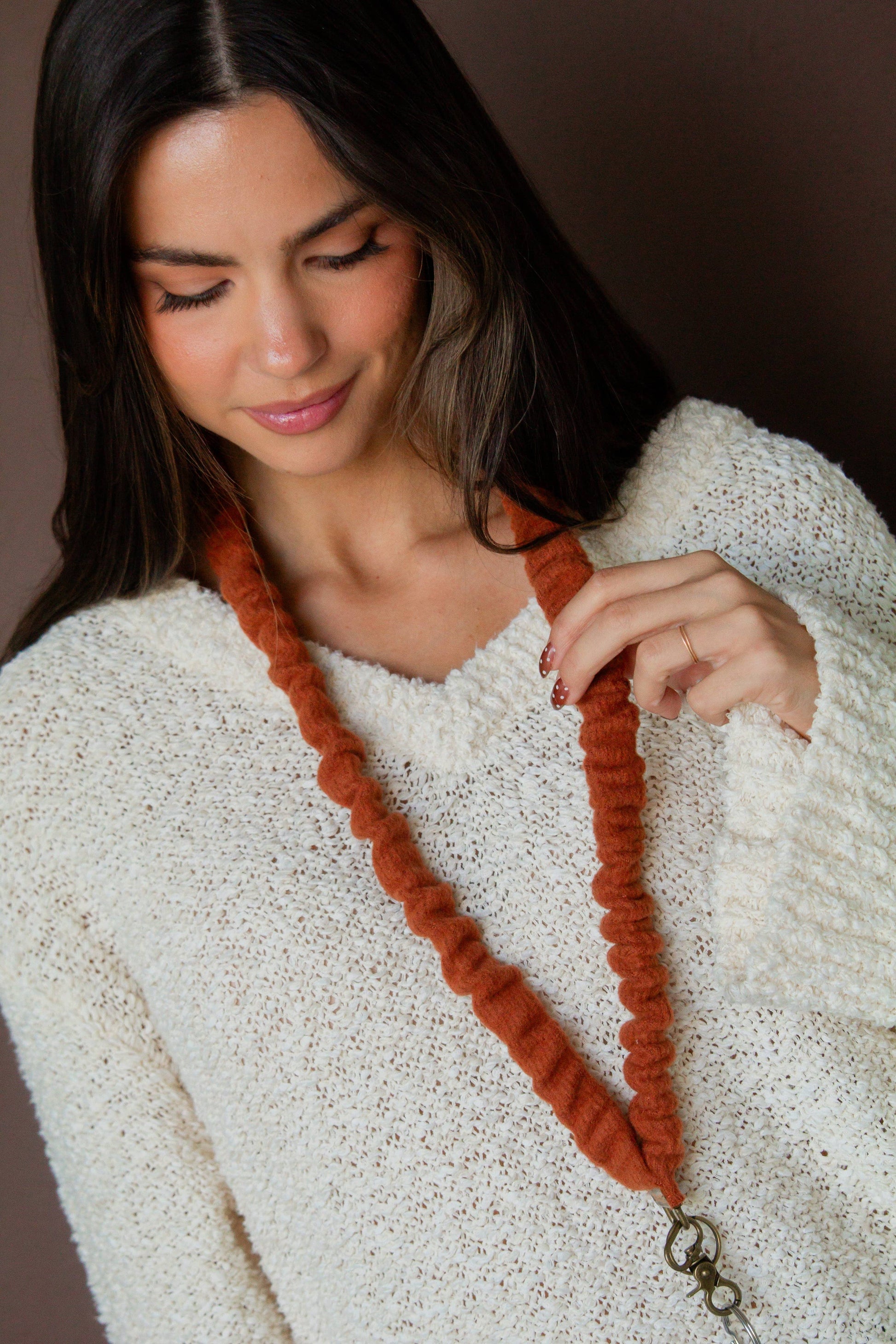 This lanyard is an absolute must have! It's the perfect rust color in the cutest cozy fabric. This one will be perfect for the fall season, you can't go wrong with it--it'll go with all your outfits this fall! Gone are the days of full hands with no pockets; our lanyards give you one less thing to worry about.