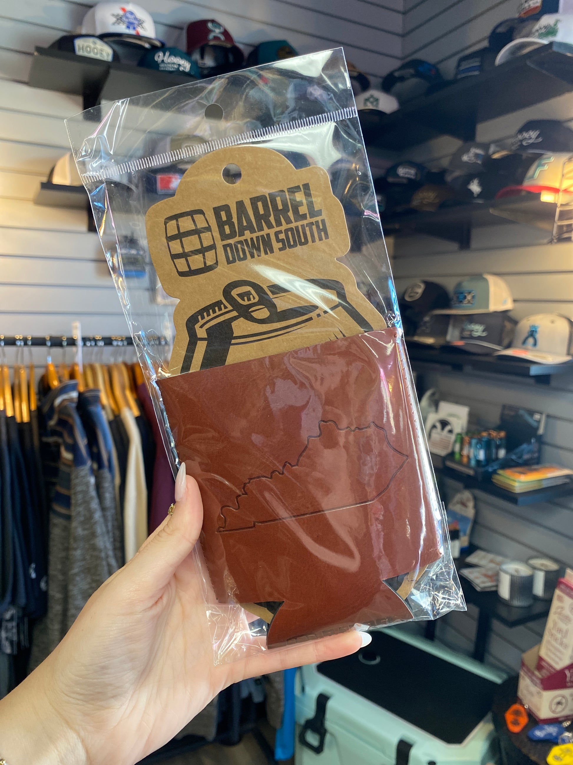 Our Kentucky Outline Can Cooler is made of faux leather and lined with neoprene to keep your favorite beverage ice cold.