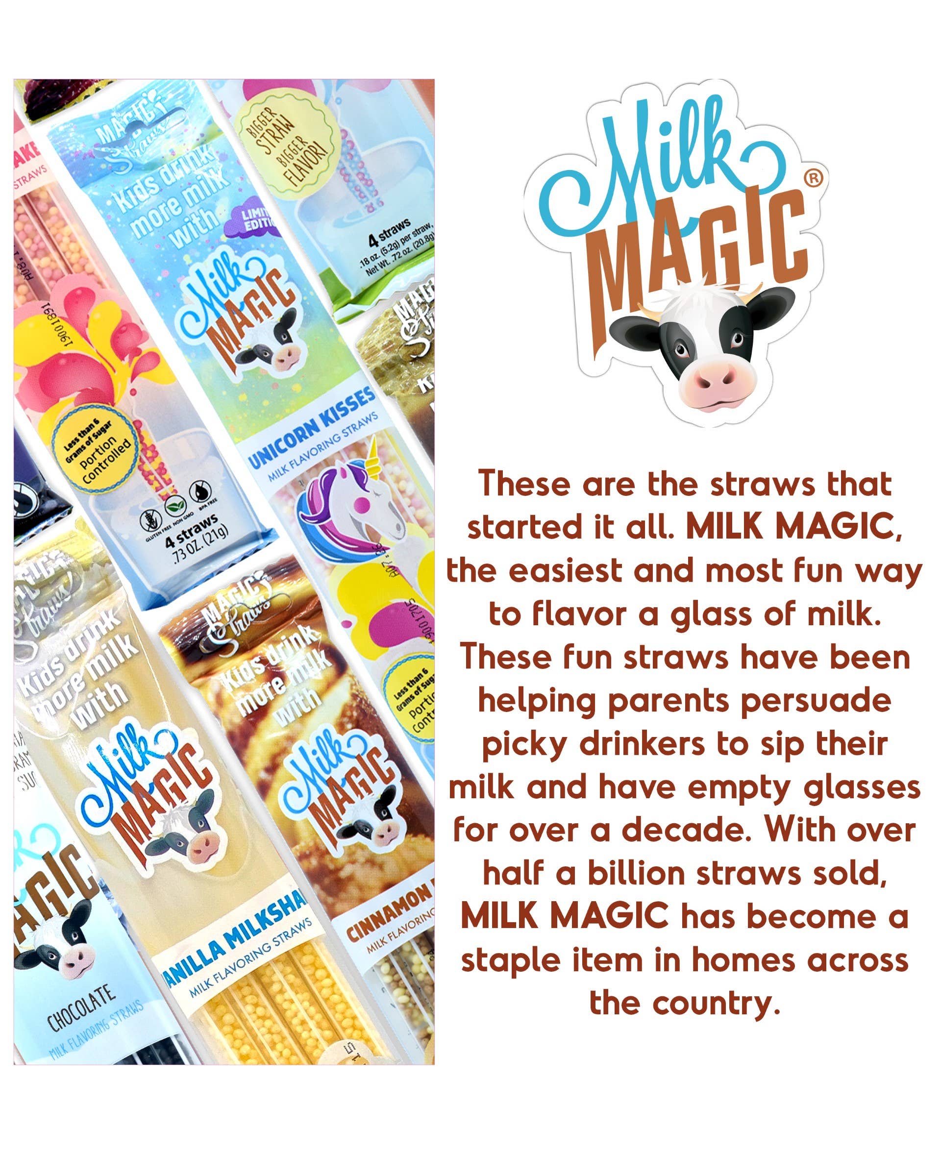 Crimped on both ends to keep the beads in and let the milk through, Magic Straws flavor the milk as you sip through the straw, turning drinking milk into an event!