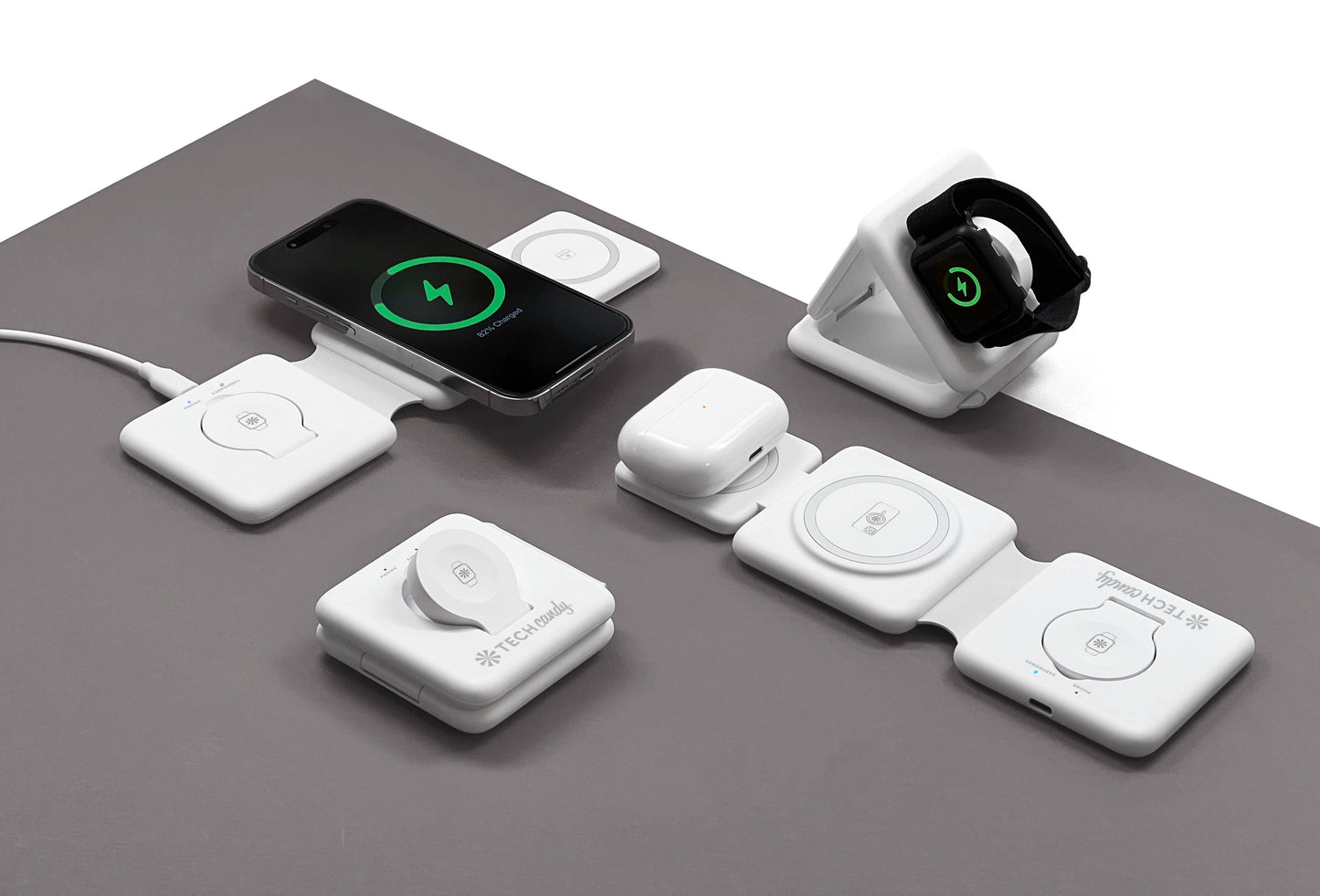 • So many things to power! Charge them wirelessly with The Three WayTM Charging Valet. You can even charge them all at once. This tiny Qi & MagSafe charging strip is made for your wireless charging- equipped phone, earbuds & watch. Just place your devices on each pad for the magic to begin.