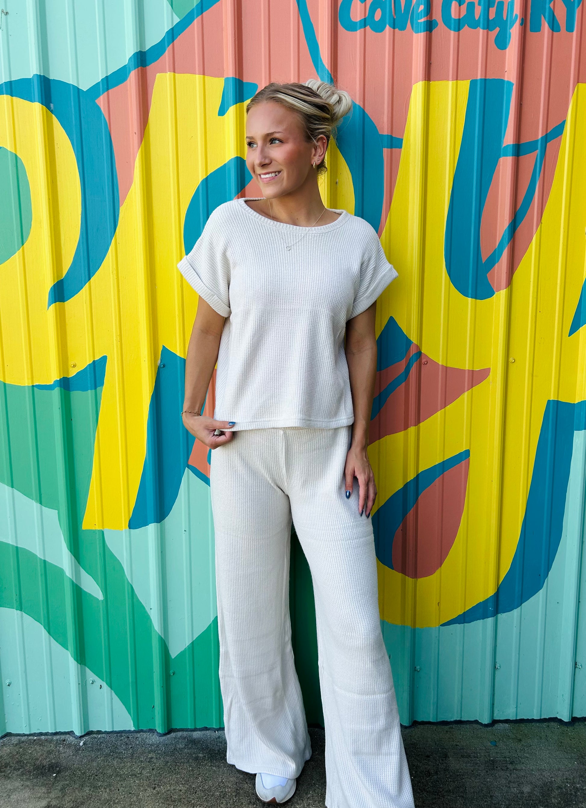 This set makes the perfect outfit to throw on whenever you’re on the go! Featuring a relaxed Waffle Knit short sleeve top, an elastic high waisted pant. This set is so soft and breathable. It offers the perfect blend of comfy vibes and effortless style!